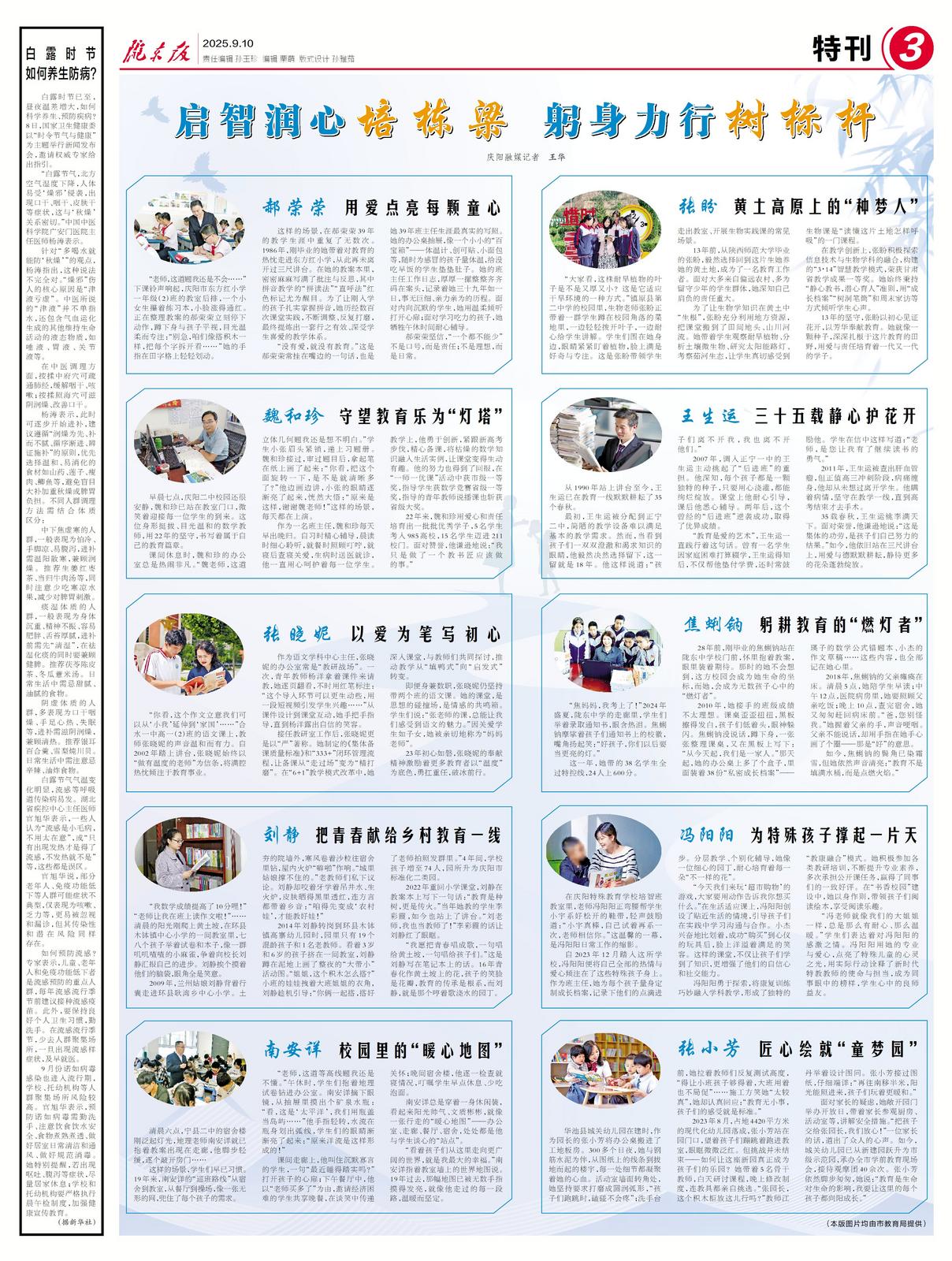 扎根鄉(xiāng)村,用愛心點亮留守兒童求學夢想;創(chuàng)新課堂,利用地方資源,把課堂搬到了田間地頭、山川河流;堅守特殊教育,用耐心與專業(yè)為特殊學生搭建成長橋梁;將辦公桌搬進工地板房,以一顆質樸匠心,繪就一方童趣盎然的幼兒樂園……