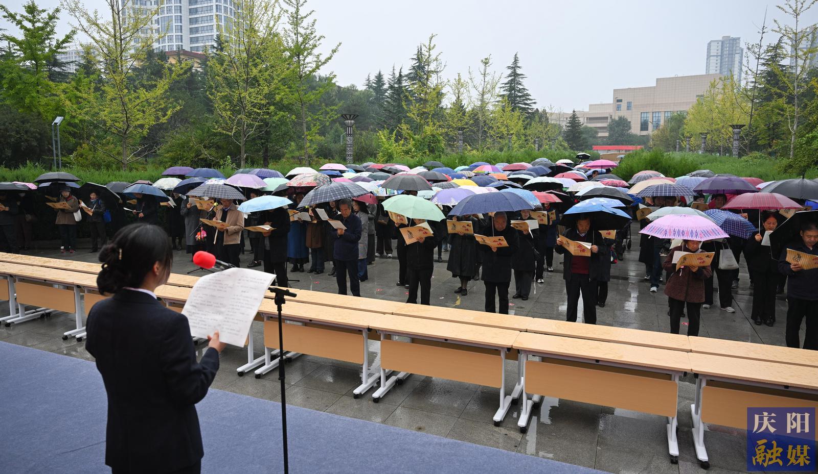 秋雨潤澤,更添莊重。全體參與者于綿綿細雨中齊聲誦讀《論語》經典篇章,在朗朗書聲中感悟先賢智慧。儀式還包括向至圣先師行拜師禮、齊誦《橫渠四句》等環節?;顒游猜?,參與者集體移步慶陽市檔案館,在欣賞《論語》書法長卷的同時,參觀了“中國共產黨人的家風”檔案展,為這場文化盛宴增添了厚重的歷史維度。