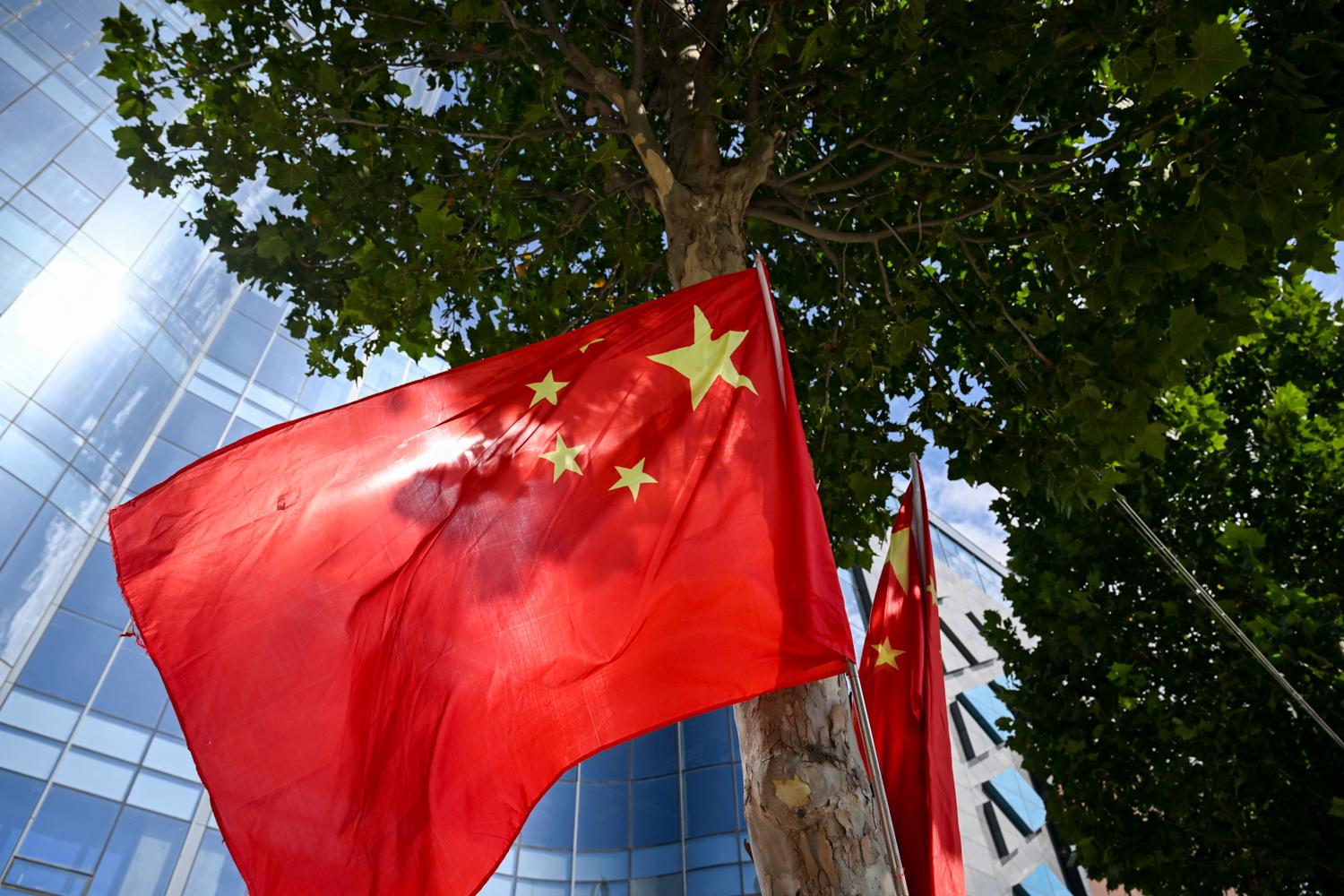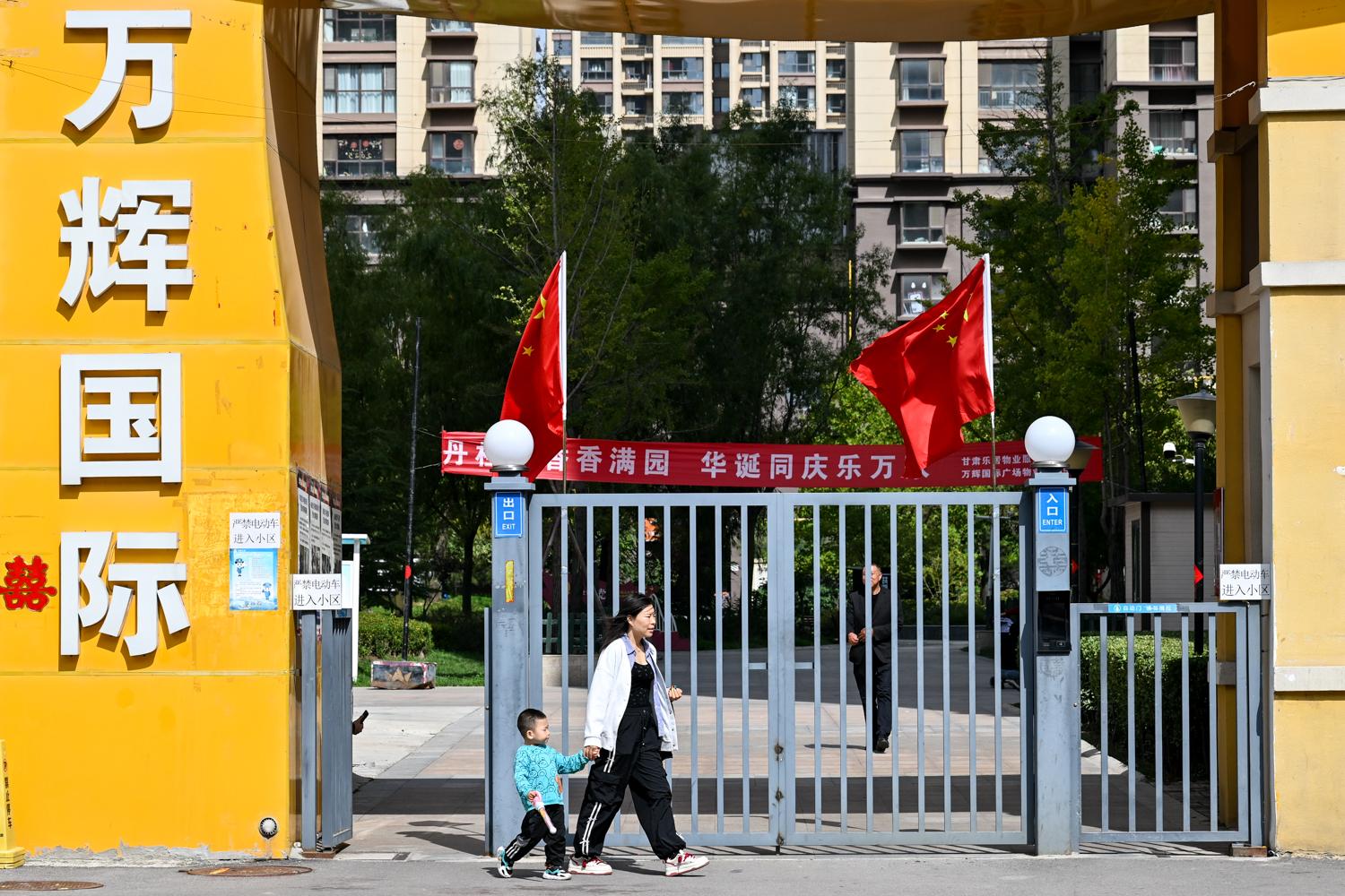 西峰區(qū)萬(wàn)輝國(guó)際居民小區(qū)門(mén)前懸掛五星紅旗。