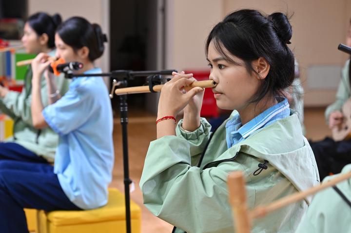 2025年6月12日,海南省民族技工學校學生在練習黎族鼻簫。近年來,海南省五指山市打造“非遺進校園”工程,在14所公辦中小學開設非遺課程,培養青少年對中華優秀傳統文化的熱愛,助力非遺傳承與發展。