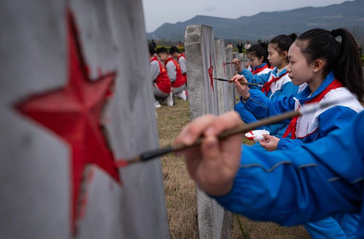 2025年3月31日,在四川川陜革命根據地紅軍烈士陵園,紅軍小學學生為無名烈士墓碑上的五角星描紅。當日,來自四川通江縣的300名中小學青少年代表,齊聚川陜革命根據地紅軍烈士陵園,在莊嚴肅穆的儀式中開啟了一堂“紀念碑下的思政課”,為埋葬在這里的25048名紅軍烈士寄去哀思。