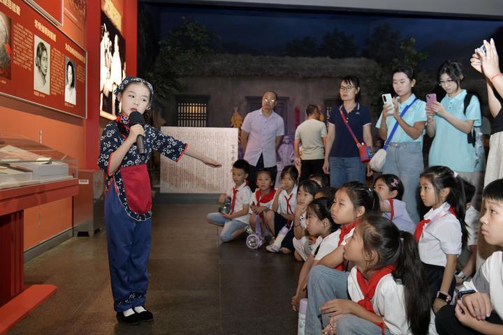 2025年8月7日,在山東省臨沂市沂蒙革命紀念館,沂蒙紅孩子文藝先鋒隊的房沫昕在講述紅色故事《沂蒙紅嫂祖秀蓮》。2024年9月,位于沂蒙革命老區的山東省臨沂市以“傳承沂蒙精神”為宗旨組建沂蒙紅孩子文藝先鋒隊,通過歌舞、朗誦、故事講述、舞臺劇等紅色主題文藝節目,增強紅色文化感染力,不斷為紅色基因代代相傳注入新生力量。