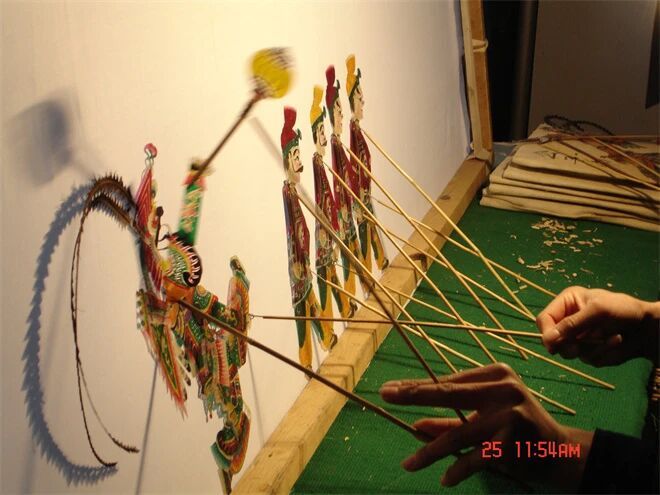 影戲演出在紙亮子上,紙亮子是影戲演出的舞臺。最早多采用白麻紙或宣紙糊成,故名紙亮子。近年來通用白布做成,所以又名“亮布”。亮布后面掛燈,最早的傳統(tǒng)是用青油點燃五根粗大的線念子,稱“神影大燈”?,F(xiàn)在,通用煤油燈或電燈代替。紙亮子前面是觀眾,后面依次是前臺、后臺演職樂隊人員。