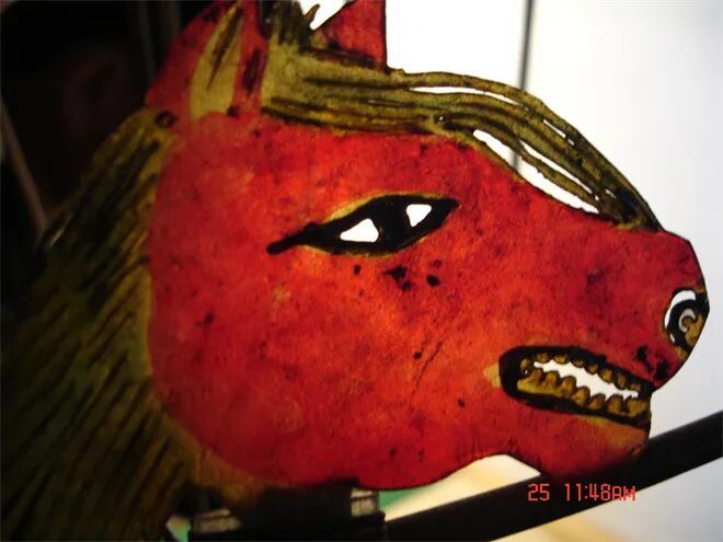 圍城前臺主演右邊,掛著一只老虎皮影。在前臺主演左邊,掛著一件皮影龍。傳統(tǒng)習(xí)俗中“青龍、白虎”都是皮影影人和演唱影戲演職人員的避邪保護神。