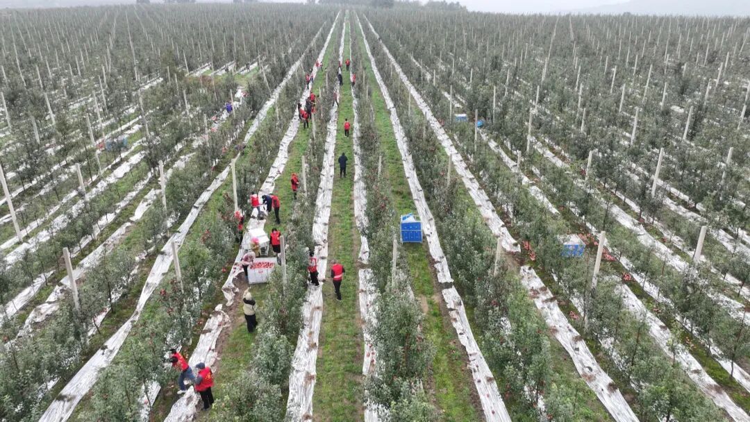 在平泉鎮五指平園蘋果基地,150多名干部群眾踩著泥濘、頂著涼意,正忙著采摘、分揀裝箱和搬運,爭分奪秒搶收蘋果,確保新鮮果實盡快入庫。