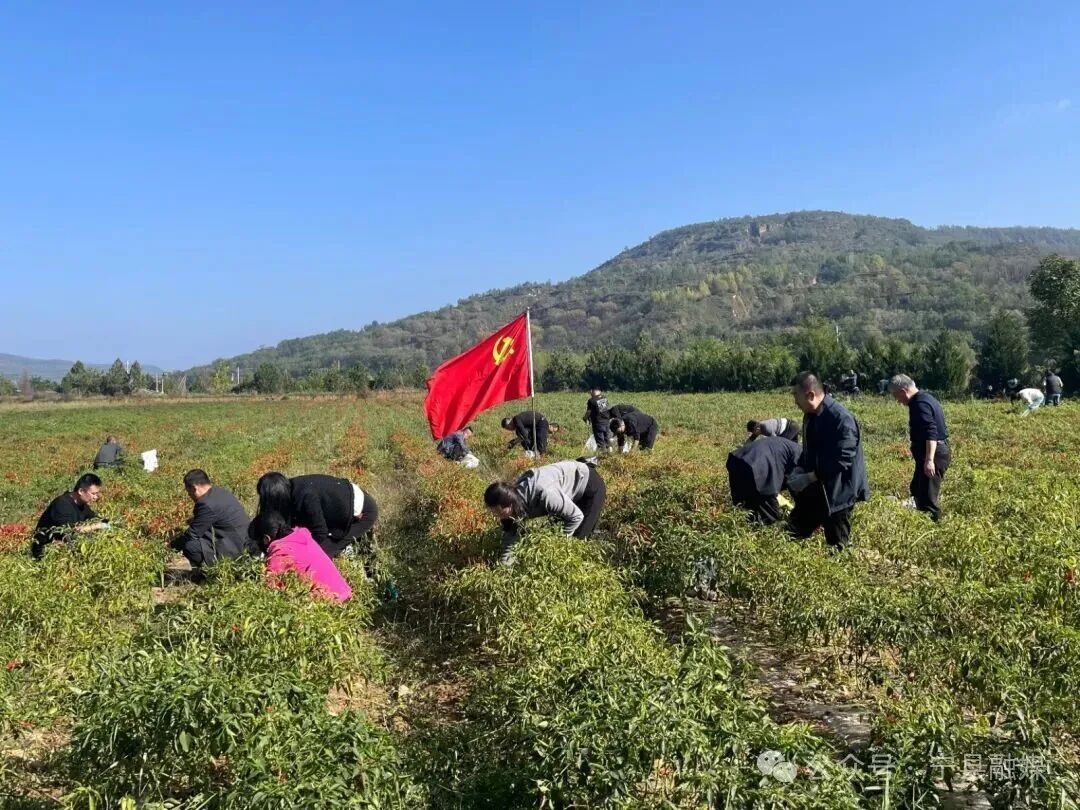 在湘樂鎮(zhèn)湘樂村辣椒基地,黨旗飄揚(yáng),連片的辣椒紅得油光發(fā)亮,像一串串懸掛在枝頭的紅燈籠。隨處可見干部職工們忙碌的身影,他們俯身于田壟間,與農(nóng)戶并肩作戰(zhàn),熟練地采摘、分揀、裝袋。鮮艷的黨旗、忙碌的身影與火紅的辣椒交織成一幅動(dòng)人的畫卷。
