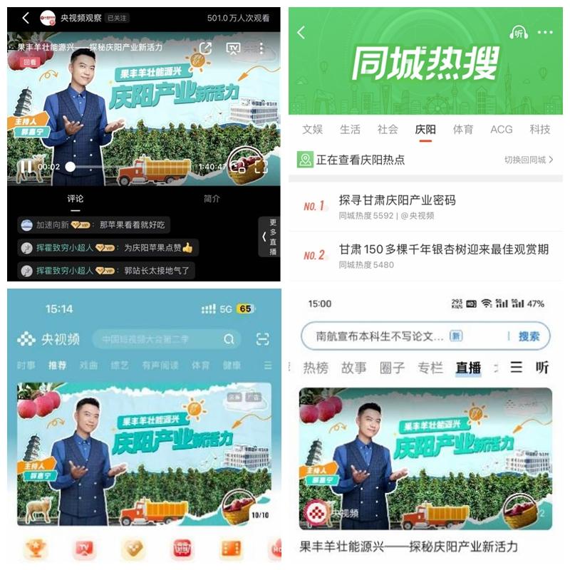 截止10月20日下午19點(diǎn),《果豐羊壯能源興——探秘慶陽(yáng)產(chǎn)新活力》2025慶陽(yáng)特色產(chǎn)業(yè)全景探訪專場(chǎng)節(jié)目直播,總直播觀看量近848.5萬(wàn)次+。微博話題#探尋甘肅慶陽(yáng)產(chǎn)業(yè)密碼#登上慶陽(yáng)同城榜熱搜第一。其中,央視頻端內(nèi)觀看量近500萬(wàn)次+;在央視頻端外微博、微信視頻號(hào)、抖音、快手、B站、頭條、百度、企鵝、優(yōu)酷等10個(gè)平臺(tái)央視頻第三方平臺(tái)賬號(hào)同步分發(fā),總觀看量348.5萬(wàn)。