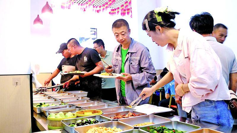 在西峰區慶州東路社區餐吧,居民有序打餐。