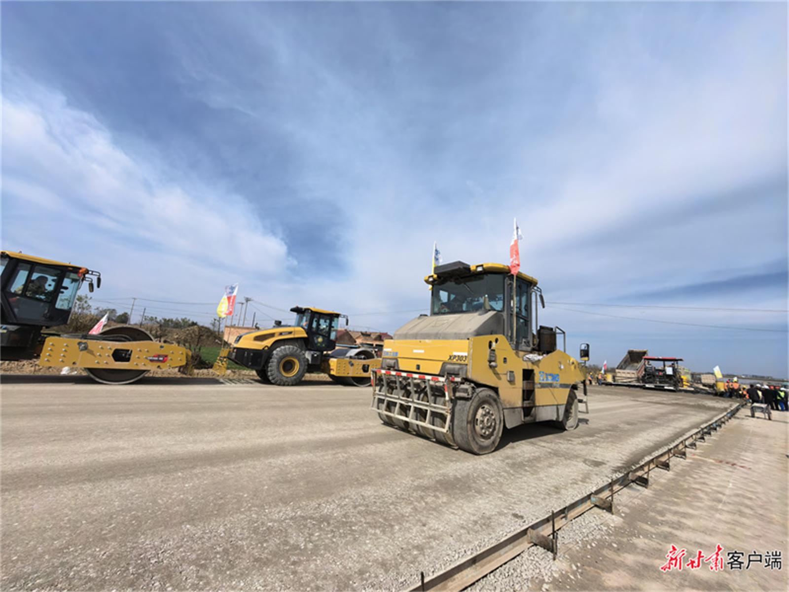 小崆峒特大橋路基與橋連接部分正在進行路面碾壓作業。