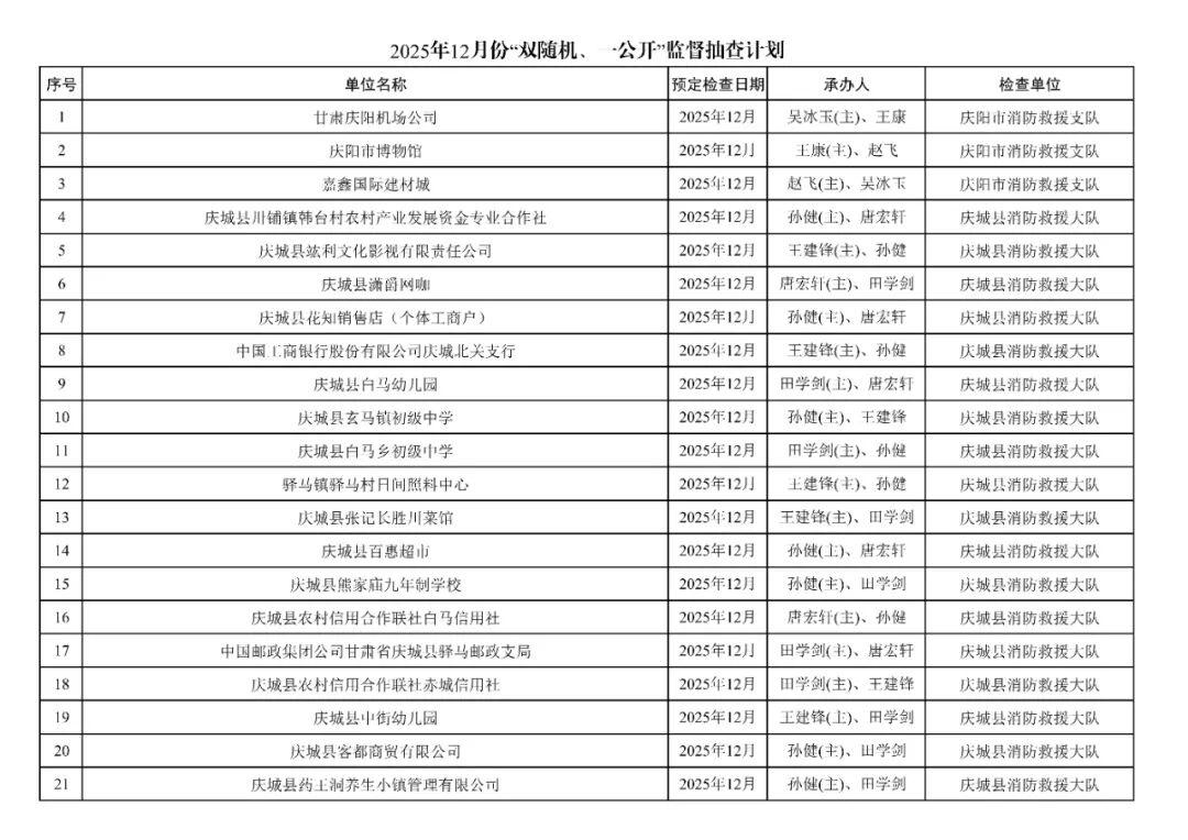 為貫徹落實《消防救援局關(guān)于全面推行“雙隨機、一公開”消防監(jiān)管工作的通知》(應(yīng)急消〔2019〕241號),認真組織實施“雙隨機、一公開”消防監(jiān)管工作,現(xiàn)將2025年11月份“雙隨機、一公開”消防監(jiān)督檢查結(jié)果及12月份監(jiān)督抽查計劃公示如下: