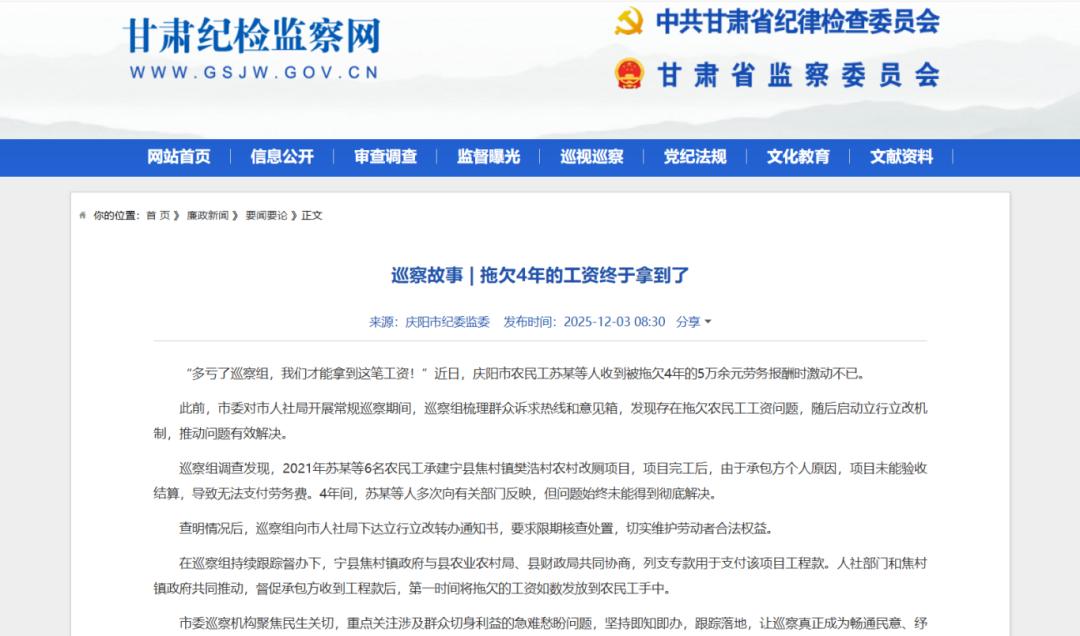 “多虧了巡察組,我們才能拿到這筆工資!”近日,慶陽市農民工蘇某等人收到被拖欠4年的5萬余元勞務報酬時激動不已。