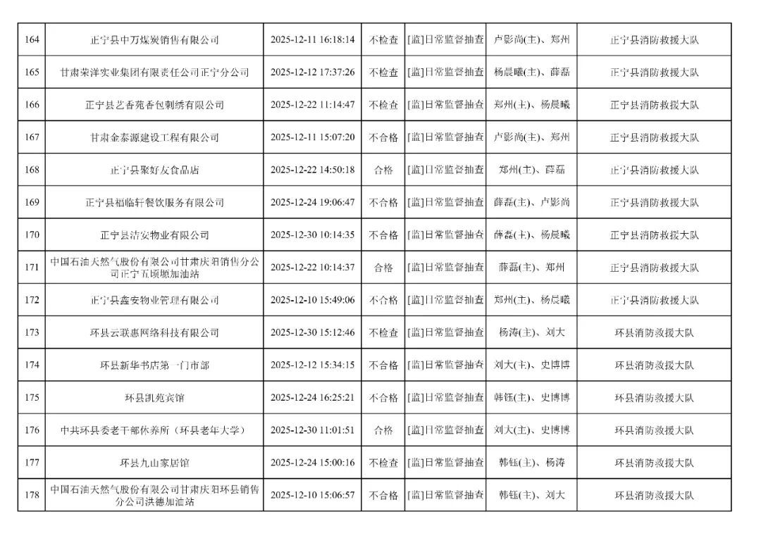 為貫徹落實《消防救援局關于全面推行“雙隨機、一公開”消防監管工作的通知》(應急消〔2019〕241號),認真組織實施“雙隨機、一公開”消防監管工作,現將2025年12月份“雙隨機、一公開”消防監督檢查結果及2026年1月份監督抽查計劃公示如下: