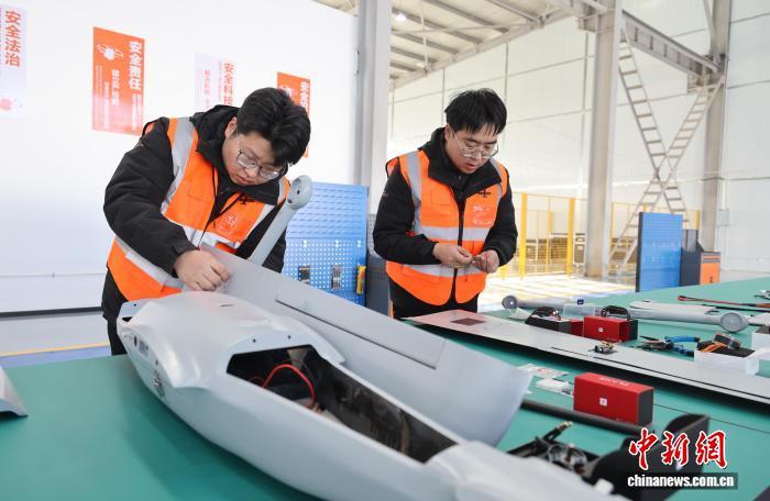 1月中旬,位于甘肅省慶陽市西峰區(qū)的西部航空科技(甘肅)有限公司工作人員制作“飛天鳳凰”表演無人機(jī)。盤小美 攝