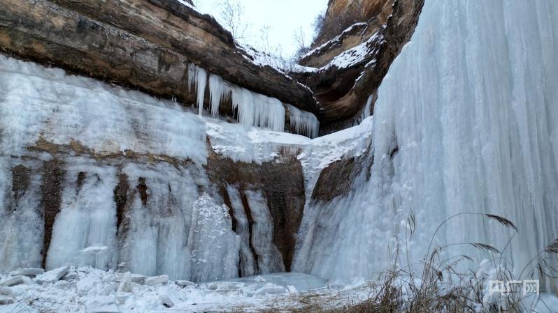 央廣網蘭州1月20日消息(記者寇剛 通訊員盤小美)數九寒天,甘肅省慶陽市西峰區肖金鎮灣鐮溝如意峽迎來絕美冰雪季,峽谷兩側巖壁上冰瀑群連片成型,渾然天成。冰瀑或垂如銀練、或凝如玉柱,造型多樣、鬼斧神工,晶瑩剔透,在陽光照射下折射出耀眼光芒,在冬日里暈染出一方澄澈清冽的冰雪天地,成為游人賞景打卡的好去處。
