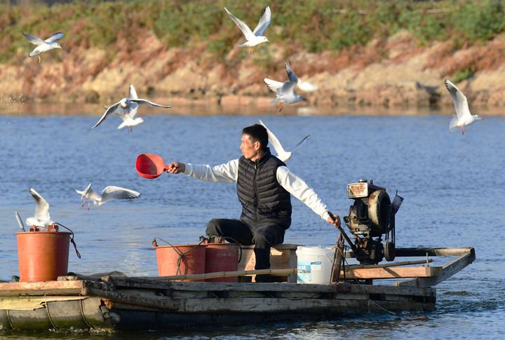 2025年12月10日,福建省漳州市佛曇鎮東坂村河豚養殖戶在給河豚投喂食物。新華社記者 魏培全 攝