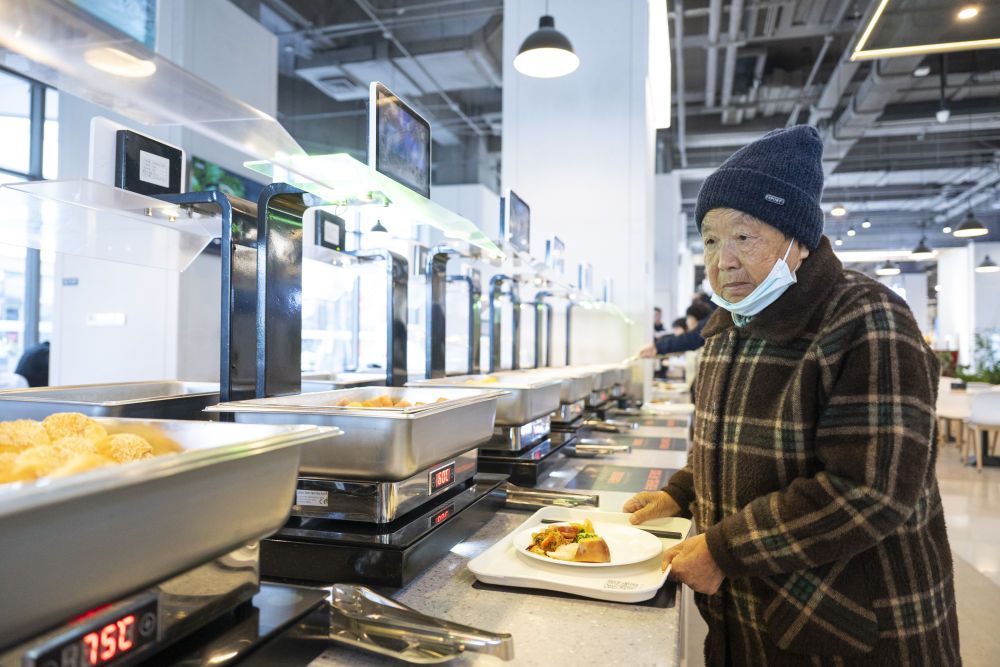 2025年11月25日,老人在雄安新區啟動區文華社區華序府智慧食堂內取餐。在這座食堂,居民“刷臉”即可完成身份識別,取餐時系統自動綁定餐盤并實時結算,實現無感支付。此外,取餐區具備智能稱重與熱量測算功能、健康一體機可以生成健康報告并提供飲食建議。