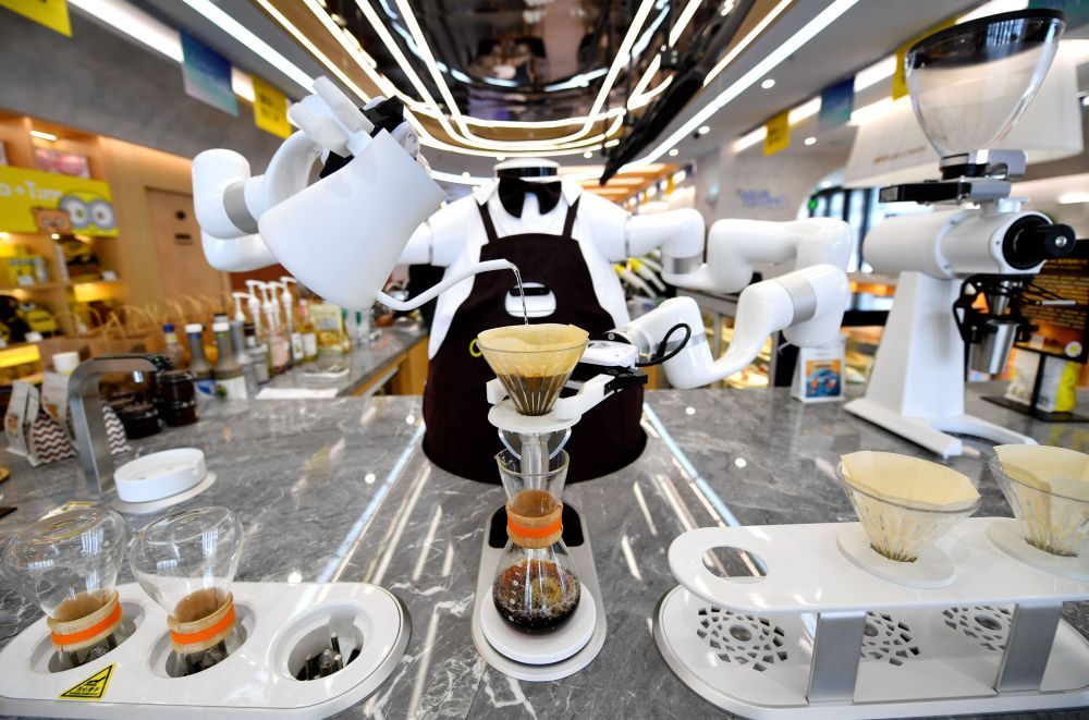 2024年1月17日,在雄安新區一家咖啡店內,AI機器人在制作咖啡。