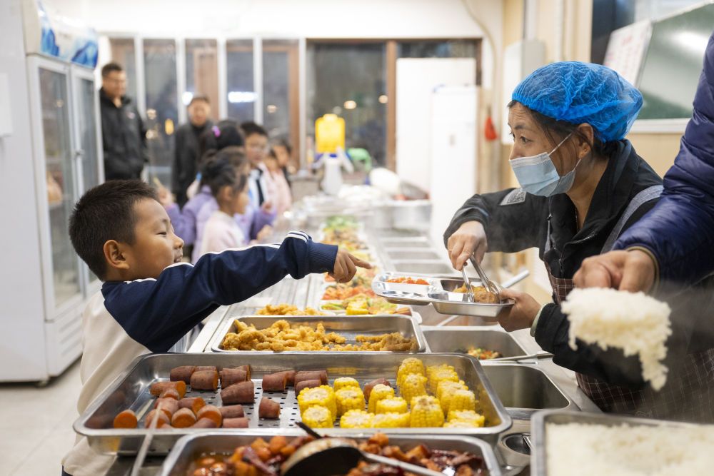 2025年11月25日,放學的小朋友在雄安新區容東片區春明北社區食堂內用餐。春明北社區食堂每天傍晚為周邊學生提供營養實惠的晚餐,有效減輕雙職工家庭負擔。