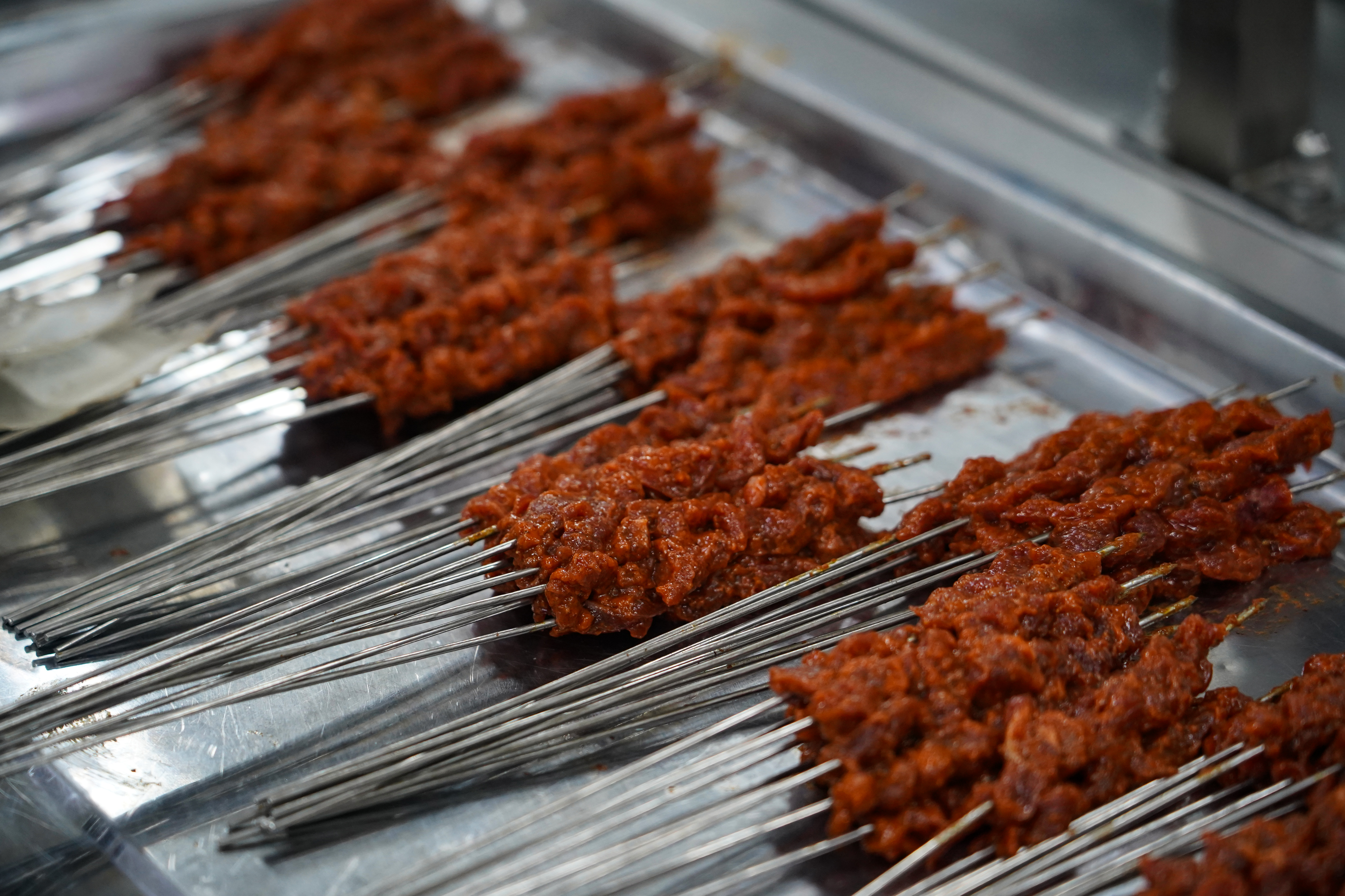 另一側新投產的生制車間里同樣一派熱火朝天,30多位工人同樣身著整潔的工作服,整齊地坐在操作臺前,手中的羊肉經過熟練的切割、稱重、穿串,再統一進行品控驗收裝袋,隨后進入速凍環節。“生制車間現有30名新老員工,其中,老員工日均穿串2000多串,新員工也能達到600多串,每天總產量穩定在4萬串左右。”生制車間組長谷桂梅的介紹,道出了生產線上的高效節奏。