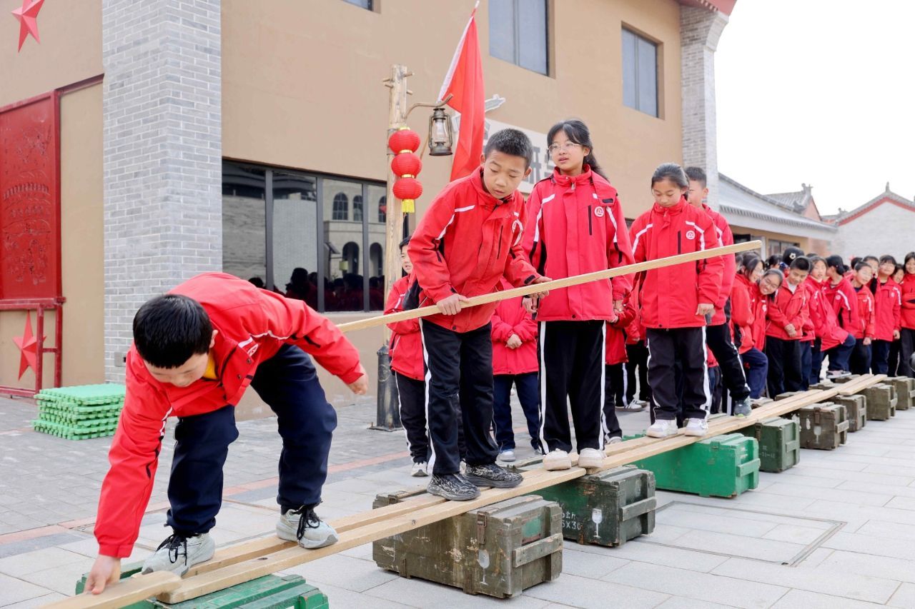 在隨后的沉浸式體驗(yàn)與徒步研學(xué)環(huán)節(jié)中,全體師生在班主任與教官帶領(lǐng)下,以整齊隊(duì)列徒步參觀長征國家文化公園南梁革命根據(jù)地核心展示園,認(rèn)真聆聽講解員講述紅軍長征總路線、途經(jīng)慶陽路線,通過實(shí)物展品與紅色故事相結(jié)合,沉浸式感悟南梁革命根據(jù)地的紅色底蘊(yùn)。在“烽火南梁城”實(shí)景體驗(yàn)區(qū),400名學(xué)生分組參與《飛奪瀘定橋》《軍民大生產(chǎn)》《保衛(wèi)糧食》四項(xiàng)沉浸式實(shí)踐活動,深刻體會革命先輩艱苦奮斗、自力更生、英勇無畏的革命精神,強(qiáng)化團(tuán)隊(duì)協(xié)作意識與責(zé)任擔(dān)當(dāng)。