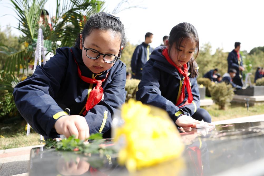 4月3日,參加祭掃活動(dòng)的學(xué)生在蘭州市烈士陵園擦拭烈士墓碑。新華社記者 陳斌 攝