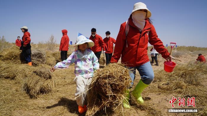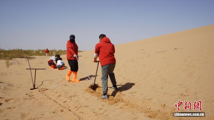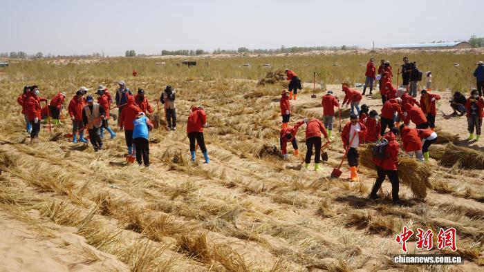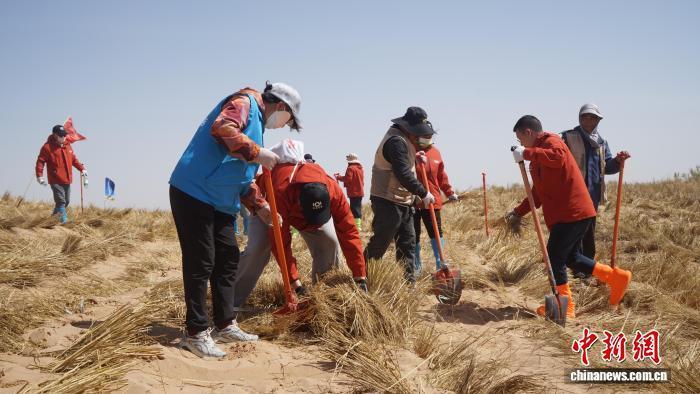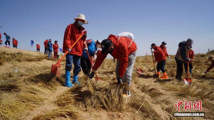 圖為民眾協作揮锨“種植”草方格沙障固沙壓沙。陳媛 攝
