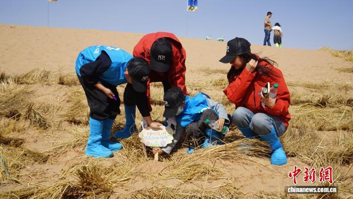 圖為民眾一家種下梭梭樹后共同立下心愿標識牌。陳媛 攝